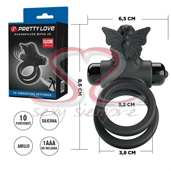 Anillo doble vibrador, con mariposa en su parte superior para estimular clítoris. Por el aro mas grande se pasan los testículos y por el mas pequeño el pene, adquiriendo su máxima erección e intenso placer con sus vibraciones. Es Pretty Love..!!