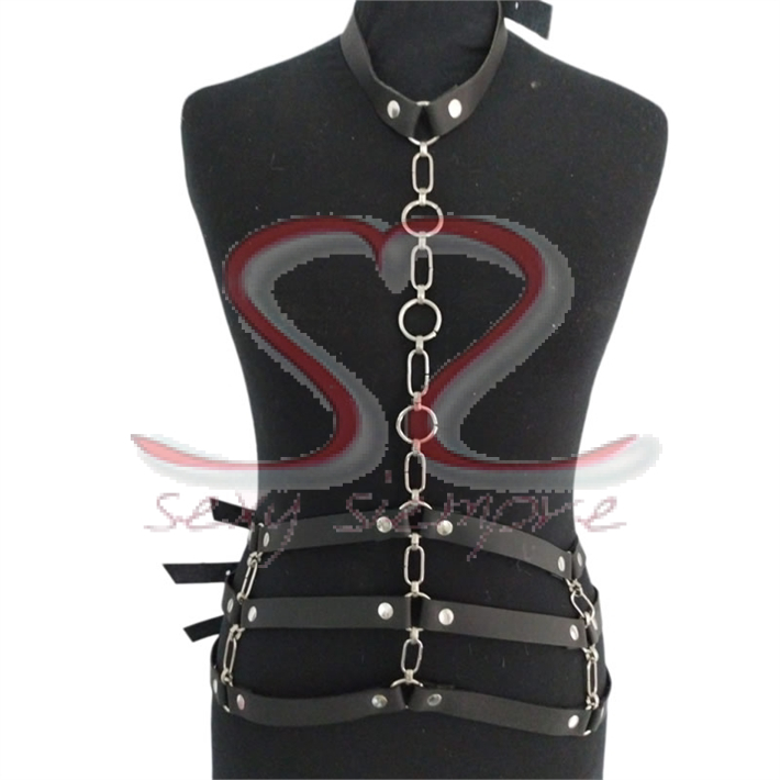 En cuero ecológico y cadenas, arnés sujetador de cuello y cintas en cadera, regulable hasta talle L.